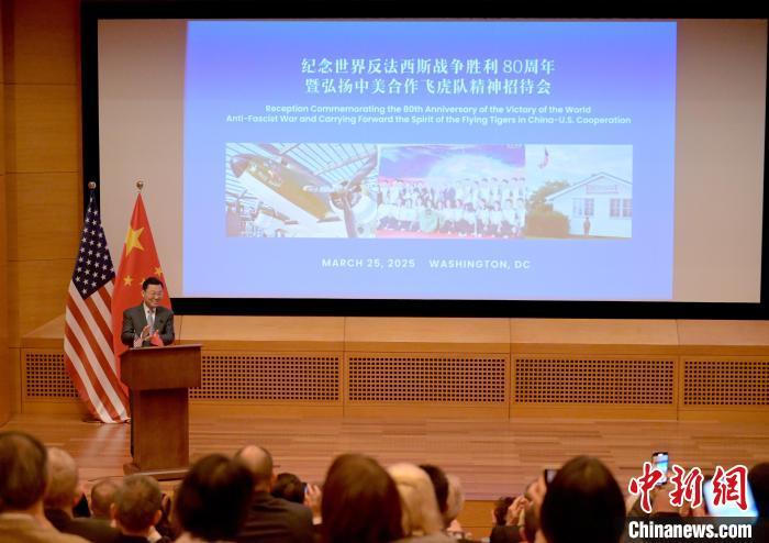當(dāng)?shù)貢r(shí)間3月25日,華盛頓,中國(guó)駐美大使館舉辦“紀(jì)念世界反法西斯戰(zhàn)爭(zhēng)勝利80周年暨弘揚(yáng)中美合作飛虎隊(duì)精神”招待會(huì)。圖為中國(guó)駐美大使謝鋒致辭。中新社記者 陳孟統(tǒng) 攝