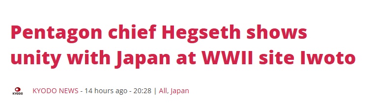 日媒報(bào)道:五角大樓負(fù)責(zé)人赫格塞思在二戰(zhàn)紀(jì)念儀式上展現(xiàn)了美日?qǐng)F(tuán)結(jié)