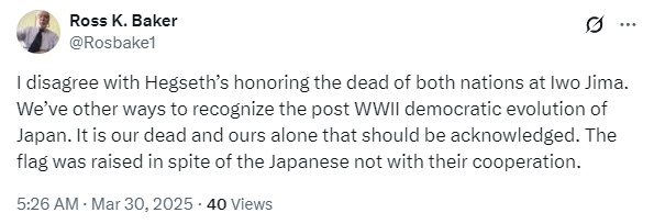 有網(wǎng)友稱(chēng):我不同意赫格塞思紀(jì)念硫磺島戰(zhàn)役中兩國(guó)的陣亡者,只有我們的陣亡者才值得紀(jì)念。