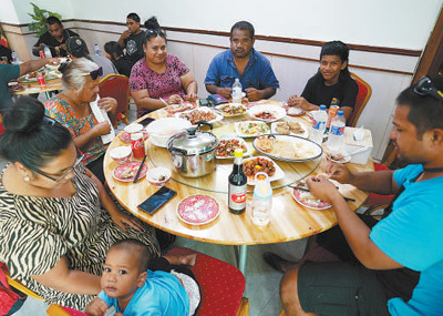 瑙魯民眾在當?shù)匾患抑胁蛷d聚餐。新華社記者 王 申攝