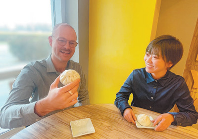 在上海迪士尼度假區(qū),卡林(左)和同事一起品嘗包子。人民日報記者 曹玲娟攝