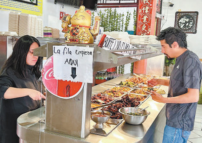 在墨西哥城一家中餐自助餐廳內(nèi),當?shù)厥晨吞暨x菜品。人民日報墨西哥分社 埃內(nèi)斯托·多明戈斯攝