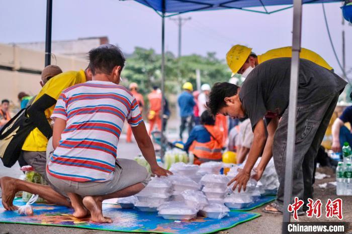 當(dāng)?shù)貢r(shí)間4月3日傍晚,緬甸曼德勒第30街附近一棟建筑因地震造成坍塌,中國(guó)救援隊(duì)持續(xù)救援,當(dāng)?shù)赜忻癖姙榫仍?duì)隊(duì)員準(zhǔn)備盒飯,感謝他們的幫助?!≈行律缬浾?陳永諾 攝
