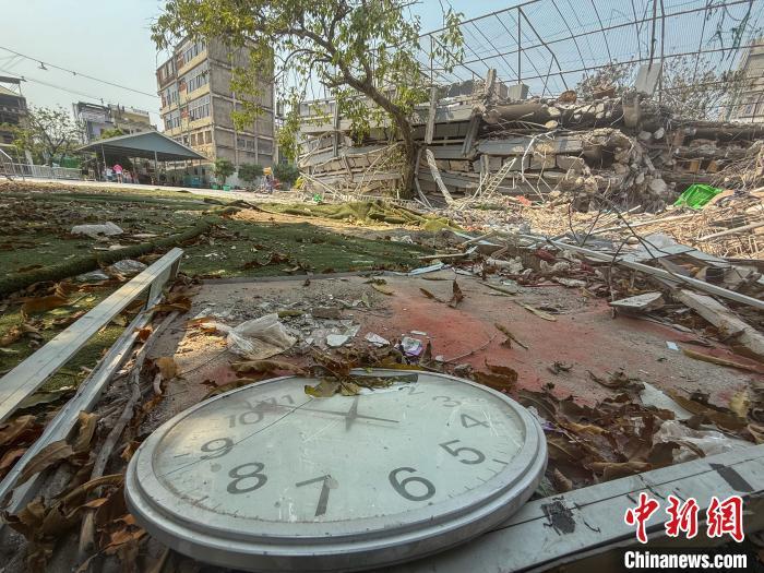 當?shù)貢r間4月2日,因地震造成教學(xué)樓坍塌的緬甸曼德勒孔教學(xué)校北校區(qū)現(xiàn)場,一臺時鐘“躺”在廢墟中,時間定格在地震發(fā)生的一刻?!≈行律缬浾?陳永諾 攝