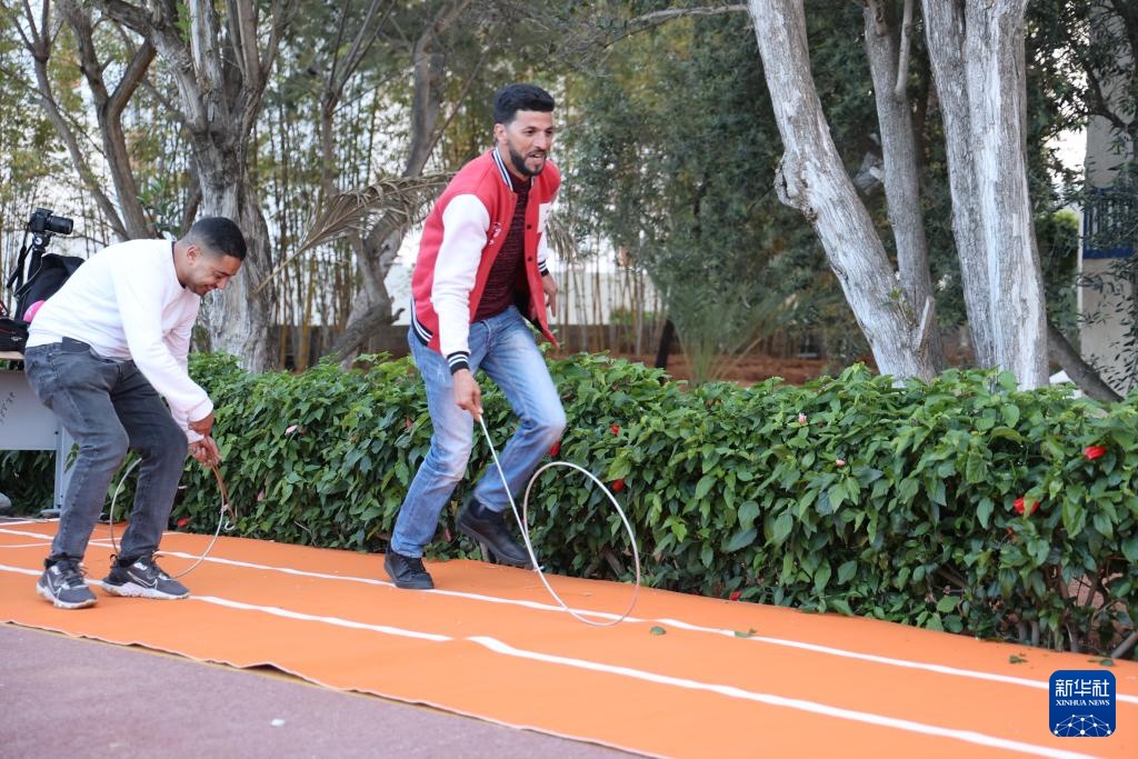 4月3日,在摩洛哥首都拉巴特的國(guó)立拉巴特高等礦業(yè)學(xué)校,兩名男子在“世界文化周”活動(dòng)的中國(guó)展臺(tái)體驗(yàn)滾鐵環(huán)。新華社記者 霍晶 攝