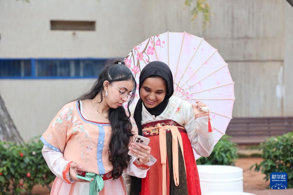 4月3日,在摩洛哥首都拉巴特的國(guó)立拉巴特高等礦業(yè)學(xué)校,兩名女孩在“世界文化周”活動(dòng)的中國(guó)展臺(tái)體驗(yàn)漢服。新華社記者 霍晶 攝