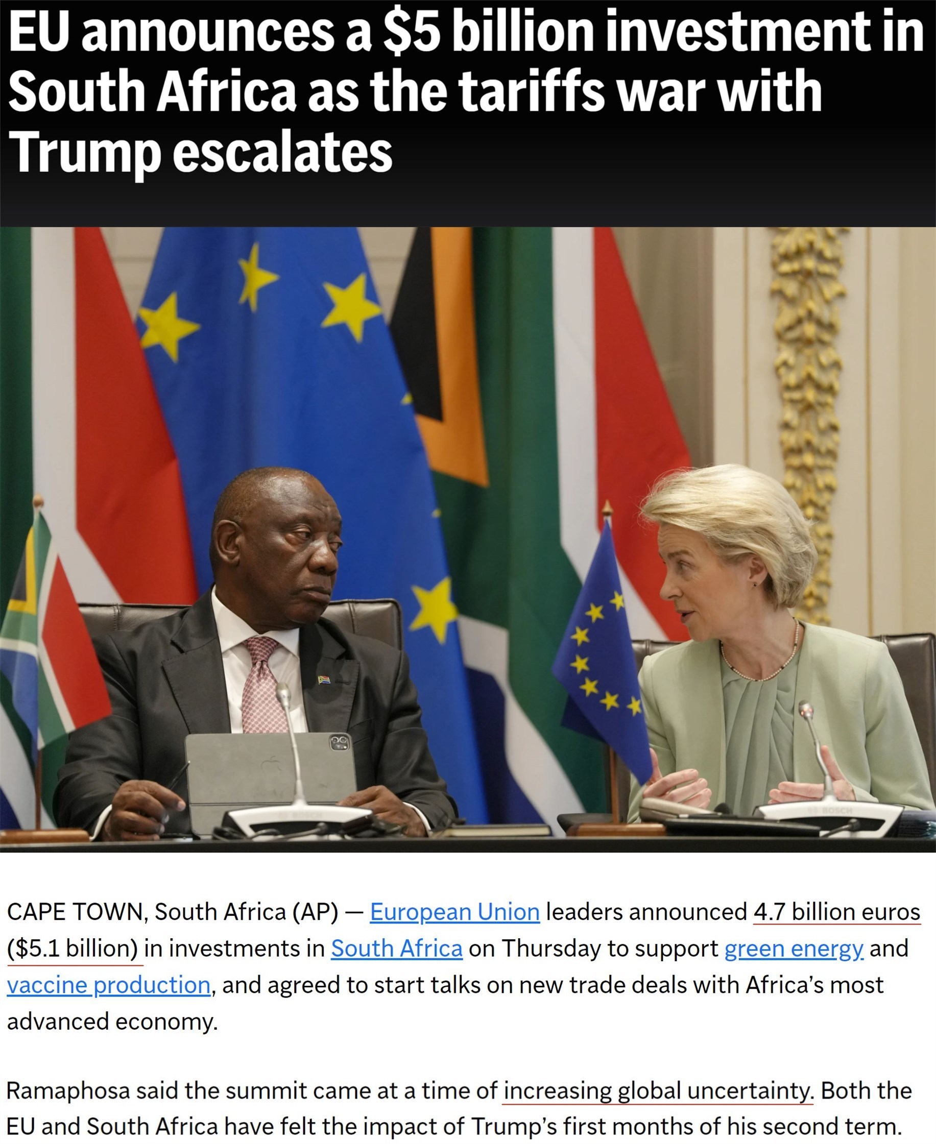 3月中旬,第八屆南非-歐盟峰會在南非開普敦舉行。會上,歐盟委員會主席馮德萊恩宣布了一項47億歐元的對南非投資計劃。馮德萊恩強(qiáng)調(diào),這一投資符合雙方利益。