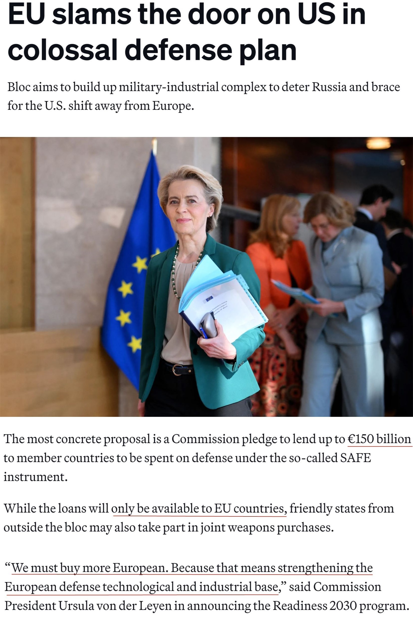 據(jù)報道,美國的軍火商被排除在1500億歐元貸款軍費(fèi)采購計劃外。