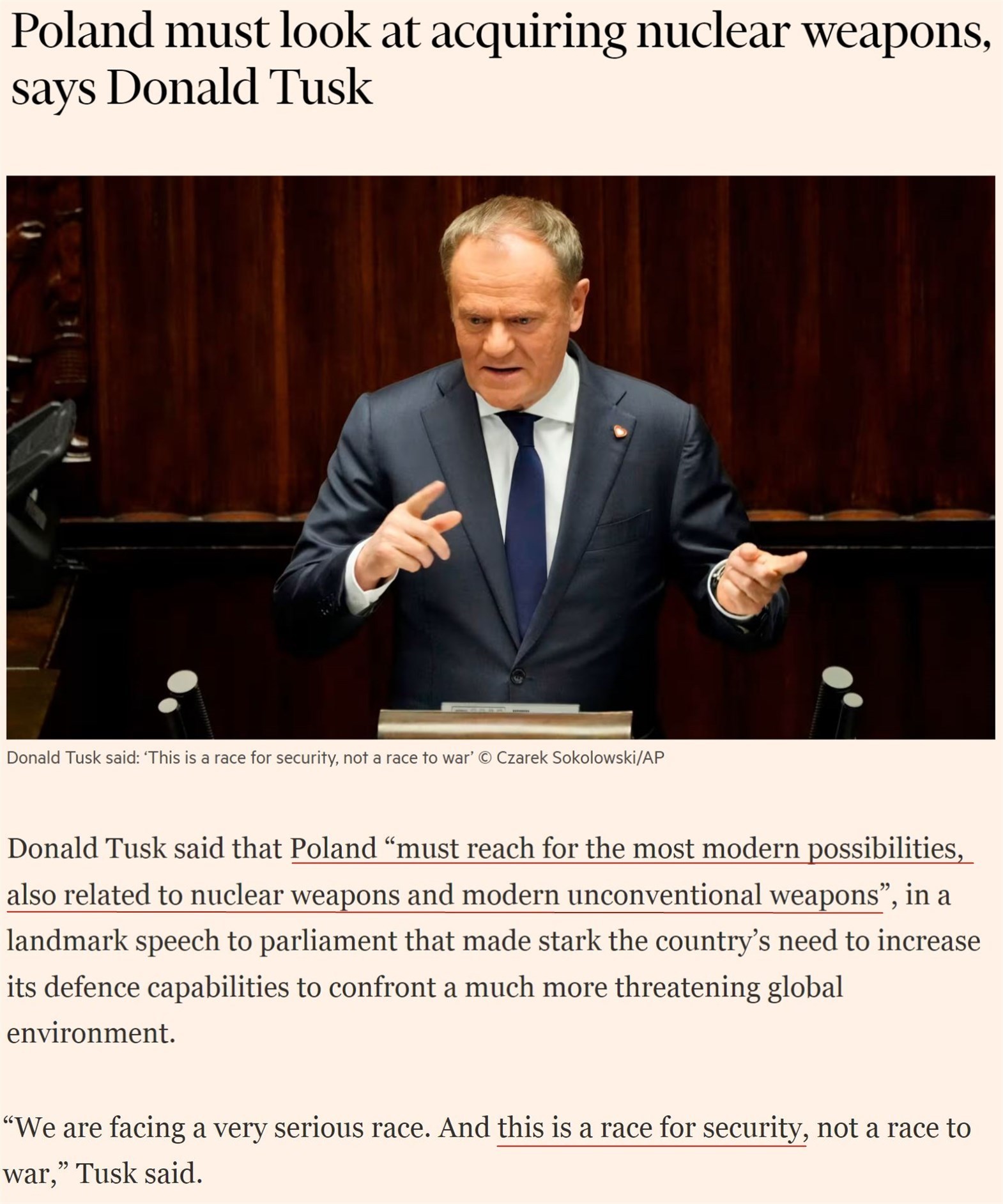 “我們必須意識到,波蘭必須爭取包括與核武器以及非常規(guī)武器相關(guān)的最現(xiàn)代化的能力。因為,這是一場爭取安全的競賽?!?/p>