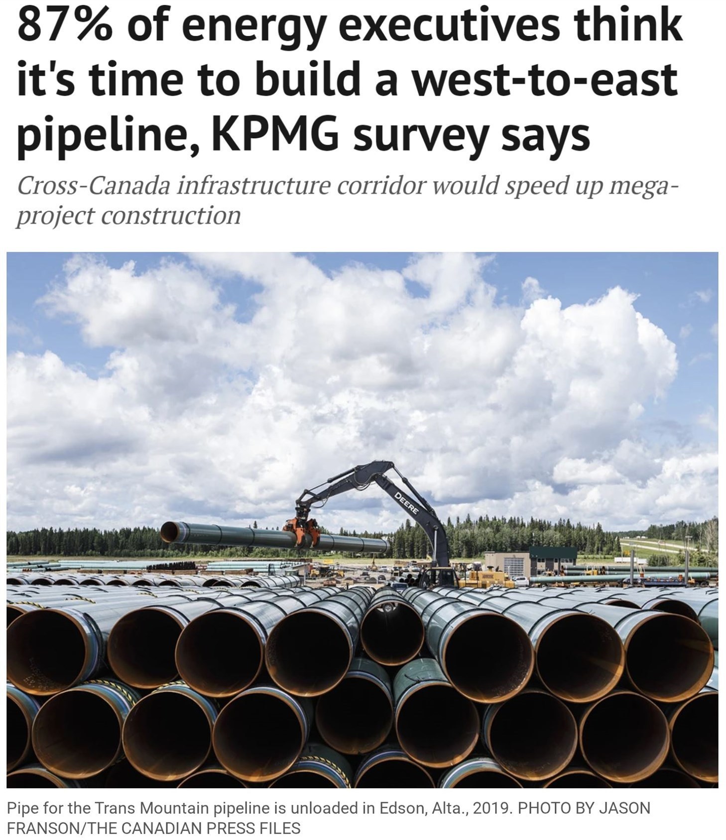 加拿大《金融郵報》日報網(wǎng)站報道:調(diào)查發(fā)現(xiàn),87%的加拿大能源機(jī)構(gòu)高管認(rèn)為是時候建設(shè)東西方向的能源管線了。