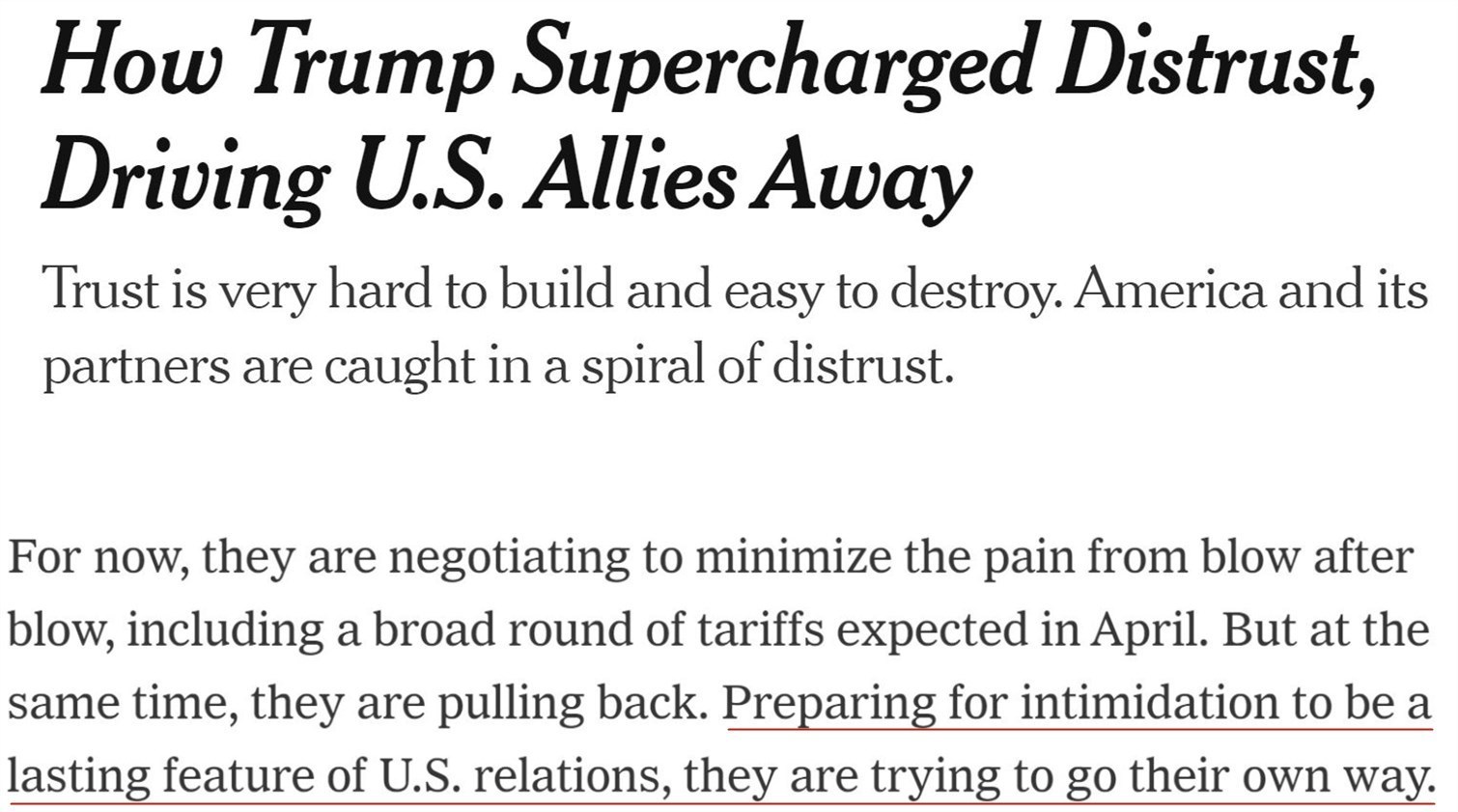 《紐約時報》認(rèn)為,鑒于“恐嚇”將成為美國對外關(guān)系的持久特點,曾經(jīng)的盟友在減少與美國的合作,因為“它們要試圖走自己的路?!?/p>