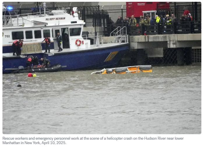 紐約市長亞當(dāng)斯在簡報(bào)會上表示:“我們對遇難者家屬和機(jī)上人員深感悲痛?!眽嫏C(jī)視頻顯示,直升機(jī)在墜入水中時沒有尾槳和主旋翼葉片。官員們表示,直升機(jī)是倒扣著墜入水中的。