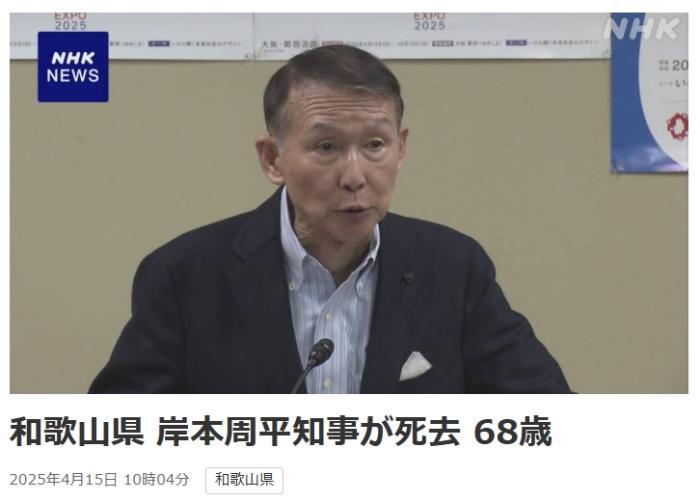 中新網(wǎng)4月15日電 據(jù)日本廣播協(xié)會(huì)(NHK)報(bào)道,當(dāng)?shù)貢r(shí)間15日,日本和歌山縣知事岸本周平去世。一天前,他在位于和歌山市內(nèi)的知事官邸被發(fā)現(xiàn)倒在地上,隨后被送往醫(yī)院。
