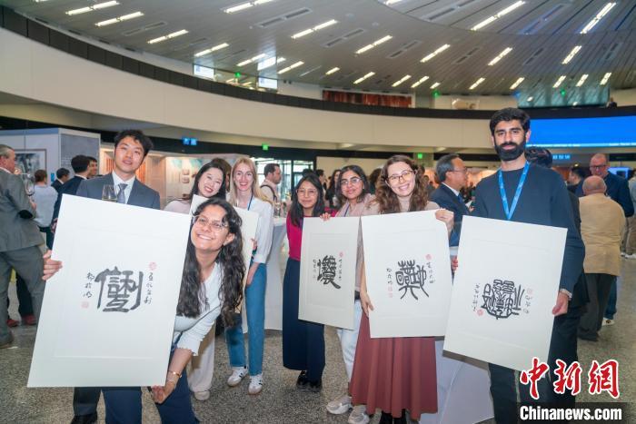 當?shù)貢r間4月14日,慶祝2025年聯(lián)合國中文日系列活動在維也納聯(lián)合國總部開幕。圖為當日來賓展示書法作品。(中國常駐維也納代表團供圖)