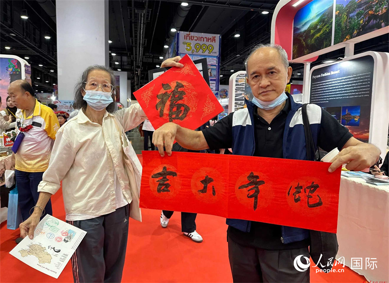 2025蛇年春節(jié),泰國市民展示他們領到的華人手寫春聯(lián)。人民網(wǎng)記者 簡承淵攝