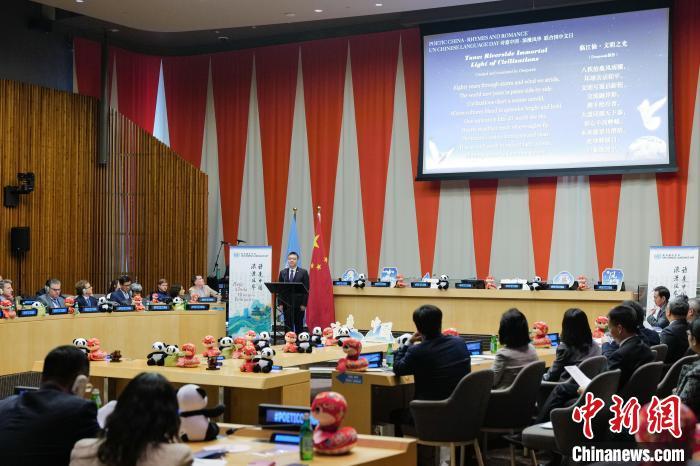 當(dāng)?shù)貢r間4月15日,2025年聯(lián)合國中文日系列活動在紐約聯(lián)合國總部開幕。圖為DeepSeek創(chuàng)作的詩詞在活動開幕式上的詩詞朗誦會亮相。 中新社記者 王帆 攝