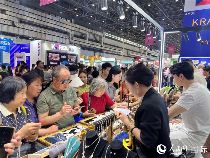消博會展館內(nèi),觀展群眾購買展出商品。人民網(wǎng)記者 趙瞳攝