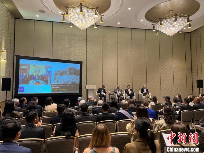 當(dāng)?shù)貢r(shí)間4月25日,美國(guó)前駐華大使駱家輝(講臺(tái)右一)出席美國(guó)華人精英組織百人會(huì)在洛杉磯舉行的2025年年會(huì)分論壇?!≈行律缬浾?張朔 攝