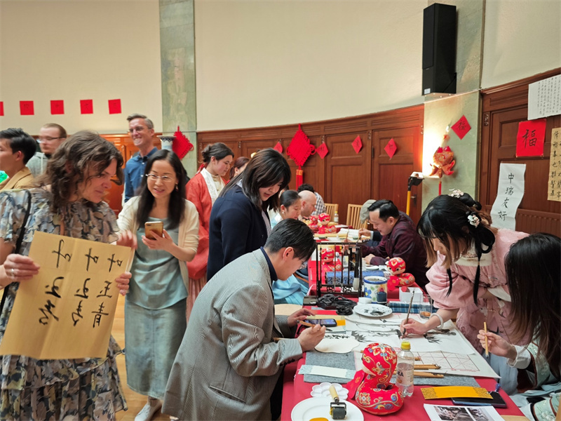隨后,來(lái)賓們根據(jù)自己的興趣進(jìn)行不同的中華文化體驗(yàn),來(lái)自瑞典的青少年下起了象棋;在書法展示區(qū),大家排起長(zhǎng)隊(duì),等待用中文寫下自己的名字,學(xué)習(xí)瑞典、中國(guó)、中瑞友好等漢字的寫法;在中國(guó)畫展示區(qū),大家一起做版畫、畫扇面,欣賞工筆畫的精巧,以及寫意畫的意蘊(yùn);在漢服展示和手工制作區(qū)域,來(lái)賓踴躍試穿漢服并合影,制作燈籠、剪紙等中華傳統(tǒng)工藝品。