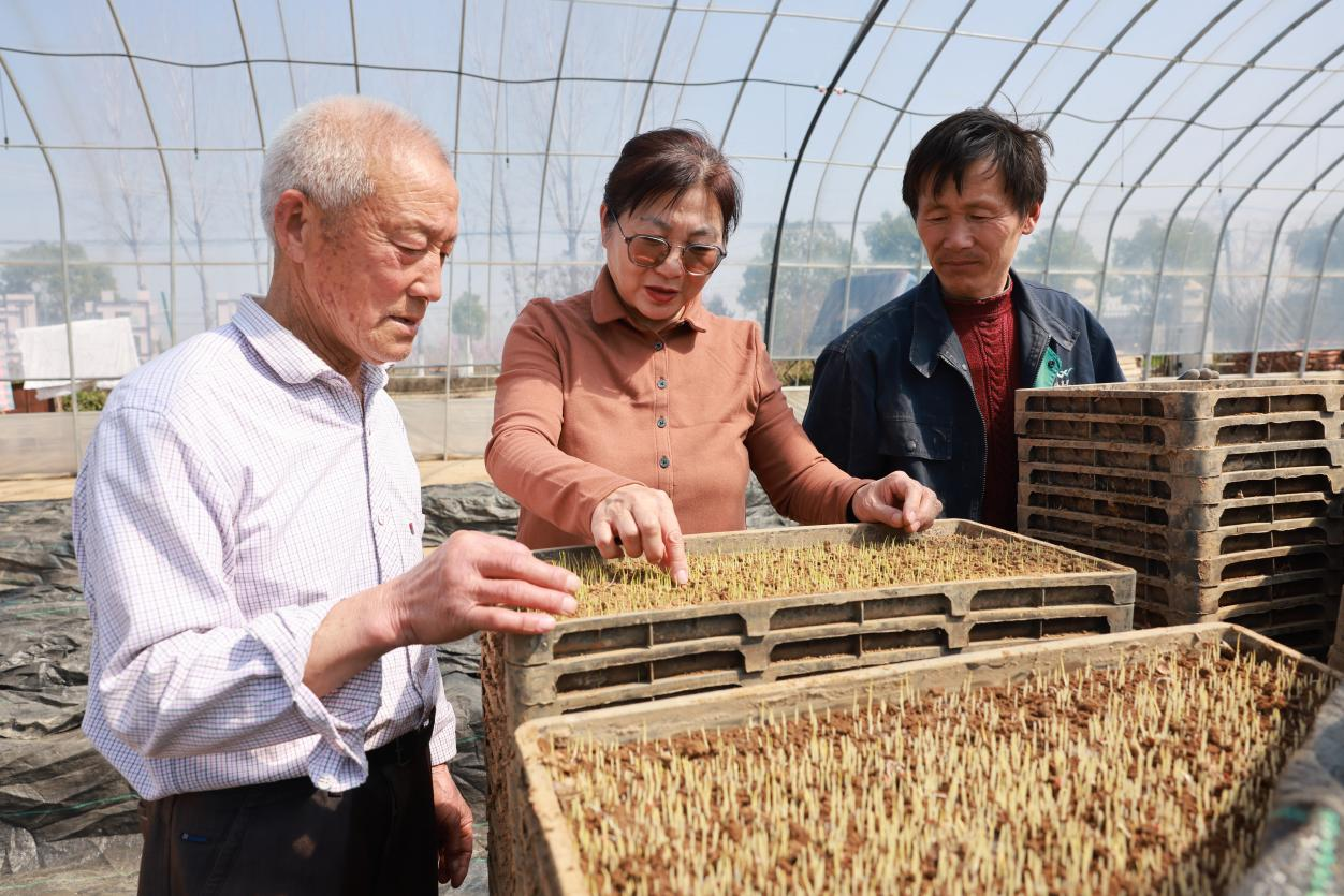 “選育良種,集中育秧,引導(dǎo)農(nóng)民科學(xué)種糧?!睆堄灼寂c員工在湖北百盛農(nóng)業(yè)科技有限公司育秧大棚里察看秧苗長勢。