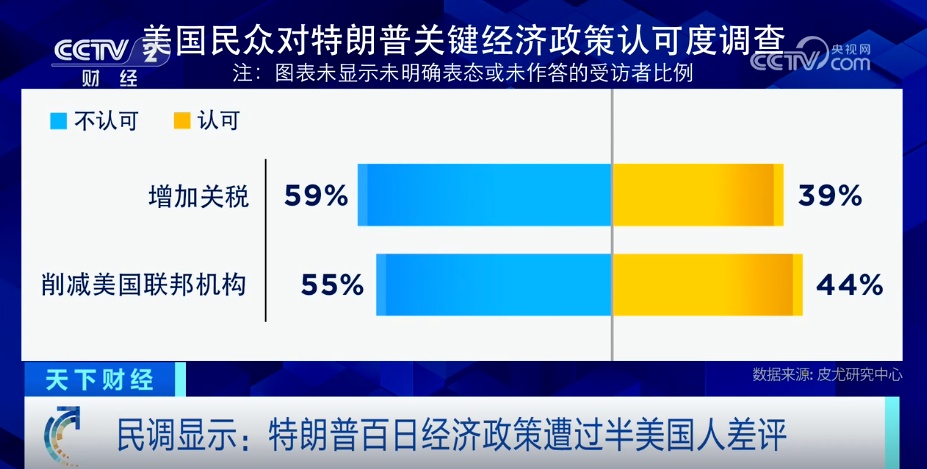 近期的多項民調(diào)還顯示出,特朗普的支持率在下降,多數(shù)美國民眾不認同他的關鍵經(jīng)濟政策。對于特朗普的總體工作表現(xiàn),皮尤研究中心的最新民調(diào)顯示,59%的美國人表示不認可,支持率僅為40%,較2月份下降了7個百分點。 而具體到其增加關稅,和削減美國聯(lián)邦機構例如裁員等措施上,超過半數(shù)的受訪者也表示不認可特朗普的政策,不認可的比例分別為59%和55%。