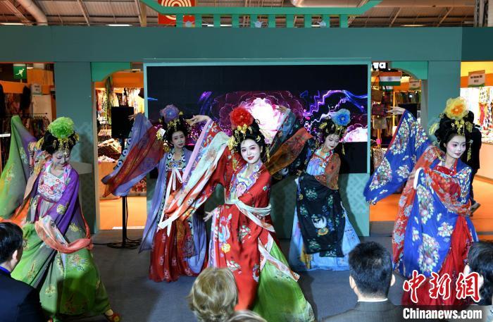 當地時間4月30日,“遇鑒中國”2025中華文化主題展在巴黎國際博覽會拉開帷幕。圖為裝扮成唐代仕女的中方參展人員在中國展區(qū)表演。 中新社記者 李洋 攝