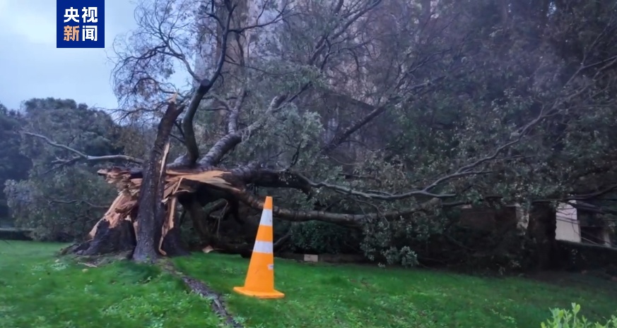 總臺(tái)記者 劉志敏:我現(xiàn)在所在的位置是新西蘭首都惠靈頓城區(qū)。大家可以看到我身后的這棵大樹已經(jīng)被強(qiáng)風(fēng)吹倒,粗大的樹干從基部斷裂,斷面參差不齊,它現(xiàn)在正平躺在前方的綠地上,不遠(yuǎn)處就是城市建筑物。受此次強(qiáng)風(fēng)、強(qiáng)降雨天氣影響,惠靈頓地區(qū)多棵樹木被吹倒,市政部門已封鎖了相關(guān)現(xiàn)場(chǎng)。