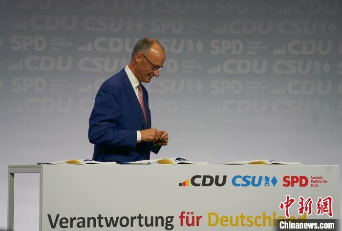 當(dāng)?shù)貢r(shí)間5月5日,聯(lián)盟黨總理候選人弗里德里?!つ脑诎亓趾炇鹇?lián)合執(zhí)政協(xié)議。中新社記者 馬秀秀 攝