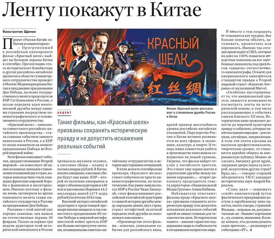 當(dāng)?shù)貢r(shí)間5月7日,俄羅斯政府機(jī)關(guān)報(bào)《俄羅斯報(bào)》刊發(fā)題為《中俄合拍電影〈紅絲綢〉將在中國(guó)上映》的評(píng)論文章。文章指出,在俄羅斯紀(jì)念蘇聯(lián)偉大衛(wèi)國(guó)戰(zhàn)爭(zhēng)勝利80周年前夕,在中國(guó)國(guó)家主席習(xí)近平應(yīng)邀對(duì)俄羅斯進(jìn)行國(guó)事訪問之際,中國(guó)中央廣播電視總臺(tái)將在莫斯科舉辦中俄合拍電影《紅絲綢》及其他中俄人文合作項(xiàng)目的推介活動(dòng),通過影視交流合作傳遞中俄世代友好。文章援引專家觀點(diǎn)強(qiáng)調(diào),電影《紅絲綢》肩負(fù)著守護(hù)歷史真相的使命,防止人類至暗時(shí)刻的歷史被篡改。