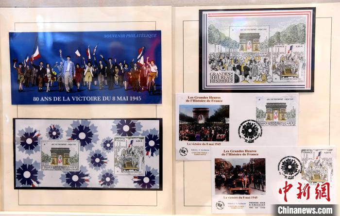 當?shù)貢r間5月7日,法國發(fā)行紀念二戰(zhàn)勝利80周年郵票。圖為蘭斯中央郵局展示的郵票圖稿和首日封。中新社記者 李洋 攝