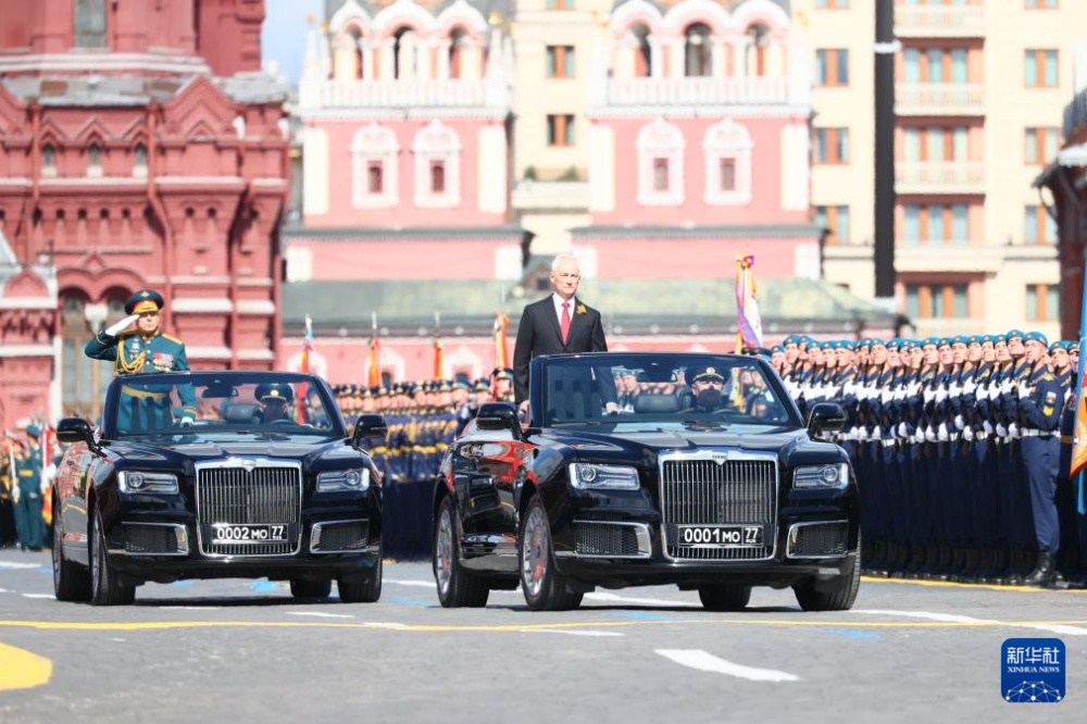 5月9日,在俄羅斯首都莫斯科,俄羅斯國防部長別洛烏索夫(前右)在紀(jì)念蘇聯(lián)偉大衛(wèi)國戰(zhàn)爭勝利80周年閱兵式上檢閱部隊。