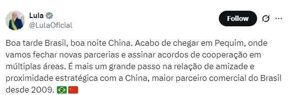 中新網5月14日電 巴西總統(tǒng)盧拉于5月10日至14日對中國進行國事訪問。抵達中國后,盧拉的社交媒體賬號連發(fā)多條帖文。