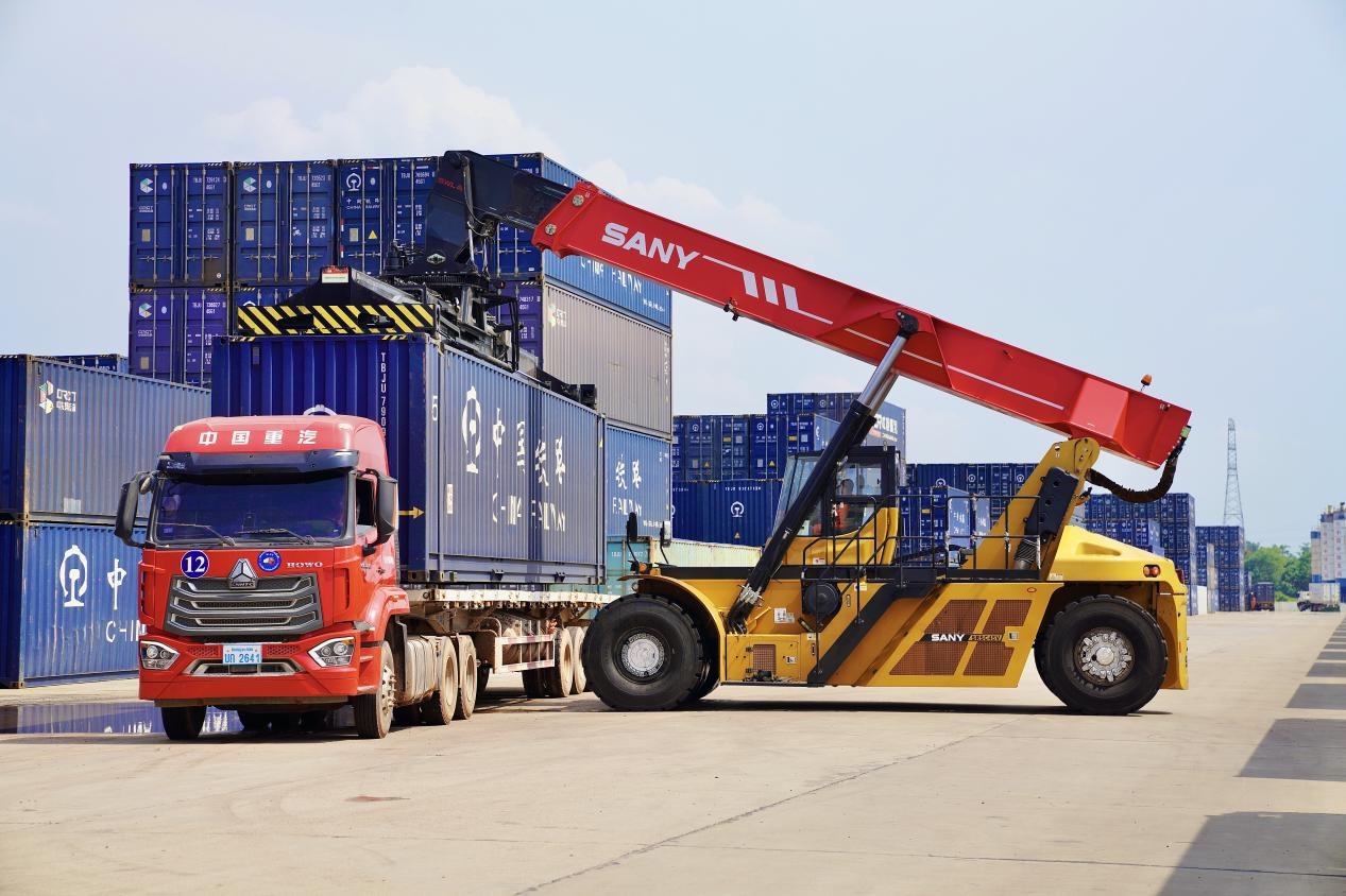 在中老鐵路萬象南鐵路貨運(yùn)口岸站,起重機(jī)正在吊裝集裝箱。劉瑩嘉攝