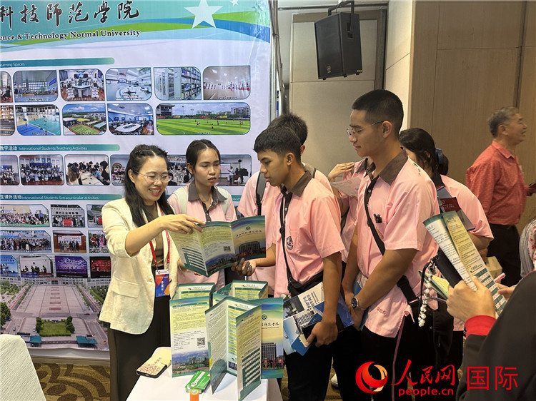 “留學廣西”國際教育展(泰國站)現(xiàn)場,各高校代表正熱情地向泰國學生介紹留學項目。人民網記者 白元琪攝