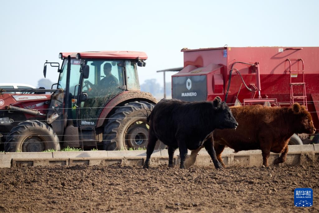 5月14日,工作人員在阿根廷潘帕斯草原萊因迪亞納牧場駕駛喂食機投食。新華社記者 孟鼎博 攝