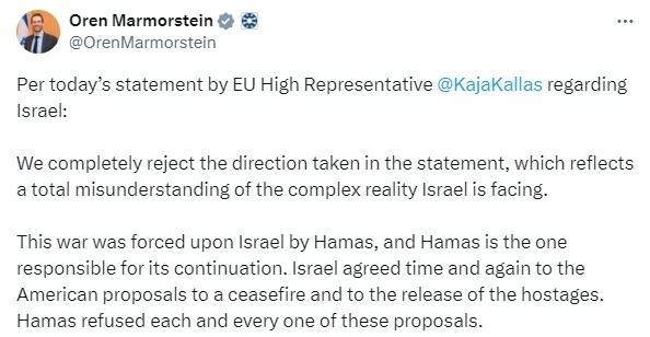 △5月20日,以色列外交部發(fā)言人奧倫·馬莫施泰在社交媒體發(fā)文回應歐盟舉措