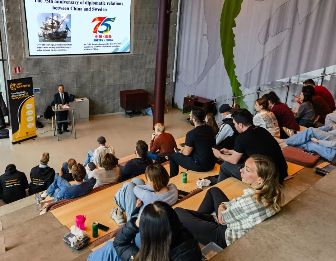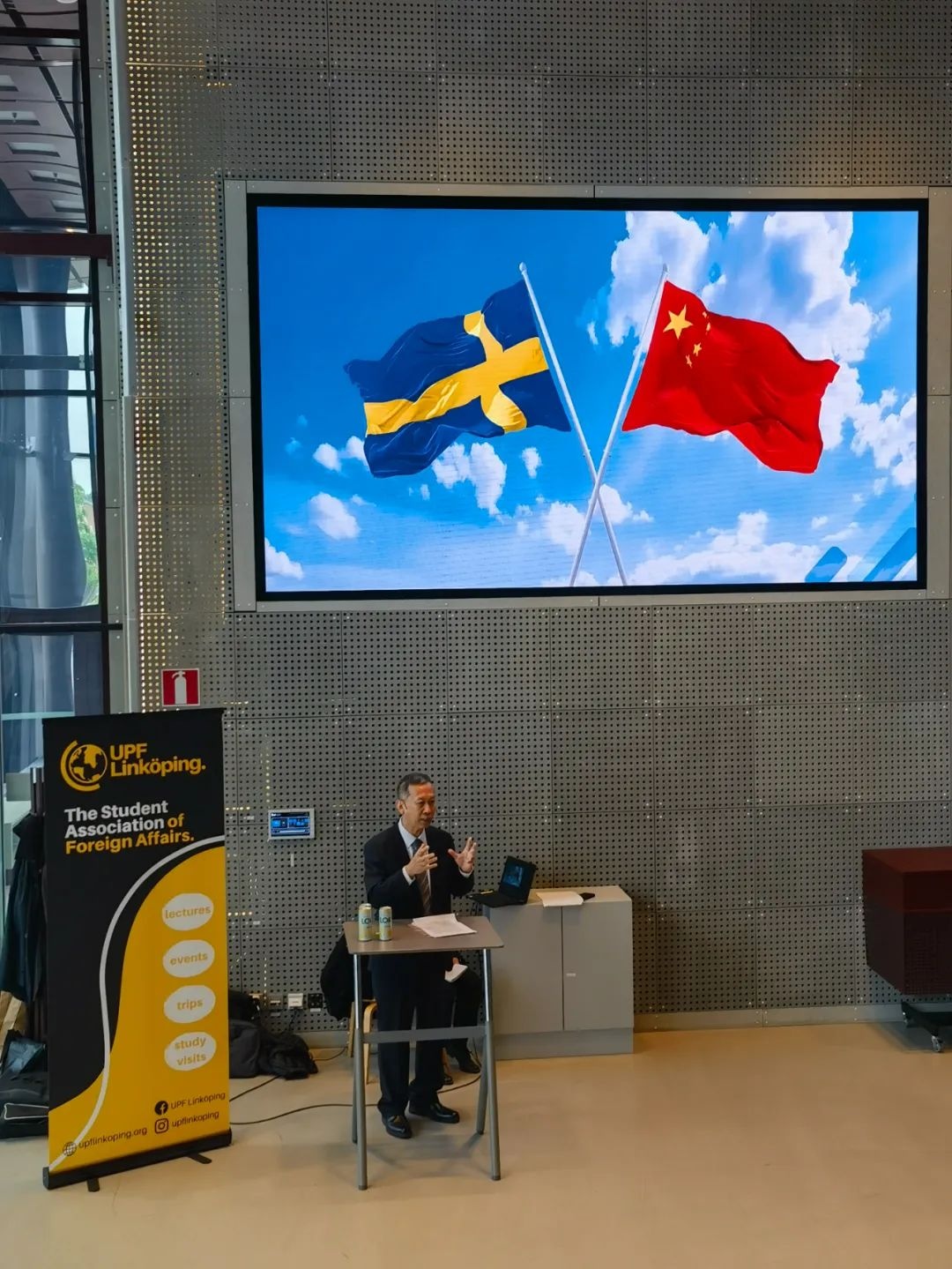 中國駐瑞典大使崔愛民在林雪平大學(xué)發(fā)表演講。中國駐瑞典大使館供圖