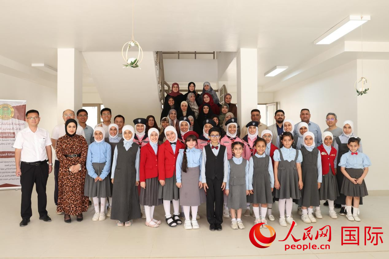 中國電建員工與阿爾穆塔·阿里卡特國際學(xué)校的師生及政府官員等合影。人民網(wǎng)記者 薛丹攝