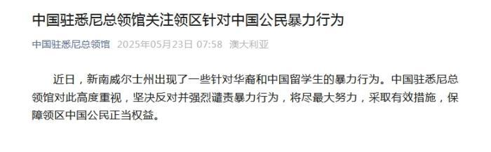 中新網(wǎng)5月23日電 據(jù)中國(guó)駐悉尼總領(lǐng)館微信公眾號(hào)消息,近日,新南威爾士州出現(xiàn)了一些針對(duì)華裔和中國(guó)留學(xué)生的暴力行為。中國(guó)駐悉尼總領(lǐng)館對(duì)此高度重視,堅(jiān)決反對(duì)并強(qiáng)烈譴責(zé)暴力行為,將盡最大努力,采取有效措施,保障領(lǐng)區(qū)中國(guó)公民正當(dāng)權(quán)益。