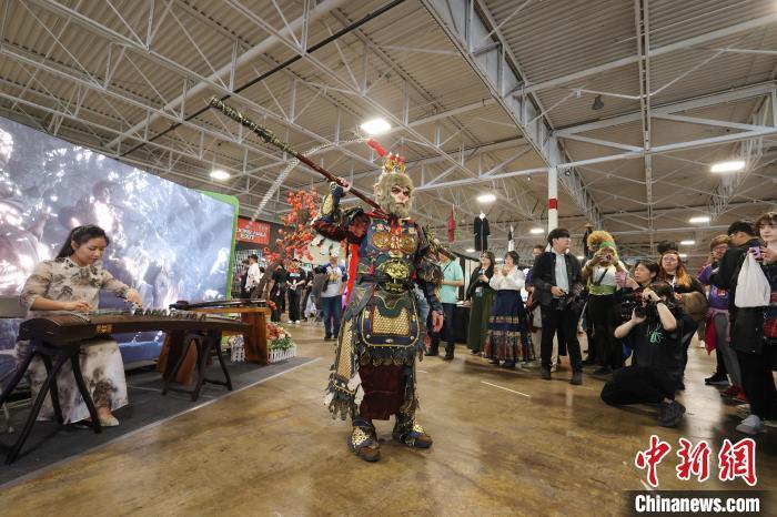 在活動(dòng)現(xiàn)場(chǎng),一位動(dòng)漫coser(角色扮演者)以中國(guó)國(guó)產(chǎn)游戲《黑神話:悟空》的悟空形象現(xiàn)身,在古箏演奏的《云宮迅音》等樂曲伴奏下舞起如意金箍棒。一時(shí)間,這一快閃表演吸引了大批動(dòng)漫迷圍觀。