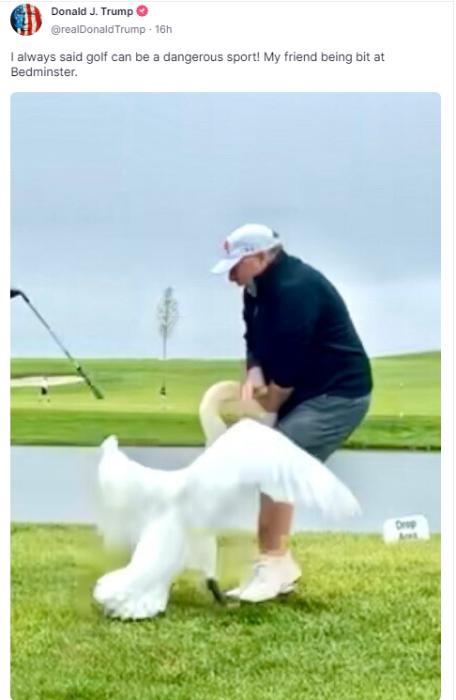 中新網(wǎng)5月26日電 據(jù)美國《野獸日報》等外媒報道,當(dāng)?shù)貢r間25日,美國總統(tǒng)特朗普在社交媒體上曬圖稱,高爾夫是一項危險的運(yùn)動,他的朋友被咬了。照片顯示,一個人在高爾夫球場上正在被天鵝/鵝攻擊。