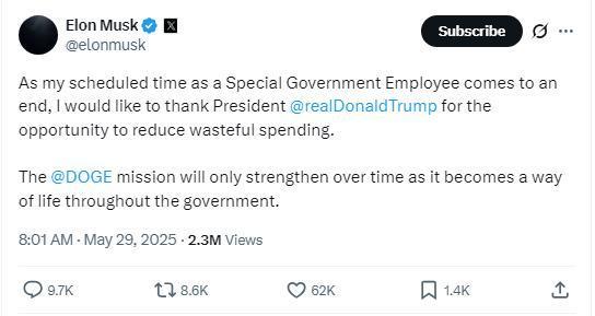 中新網(wǎng)5月29日電 據(jù)外媒報(bào)道,當(dāng)?shù)貢r(shí)間28日,美國“政府效率部”負(fù)責(zé)人馬斯克在社交媒體X上發(fā)文表示,他作為“特殊政府雇員”的任期即將結(jié)束。