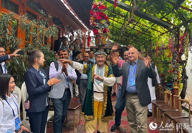 5月24日,外國媒體人在伊寧市喀贊其民俗旅游區(qū)參觀體驗。 人民網(wǎng)記者 翟轉(zhuǎn)麗攝