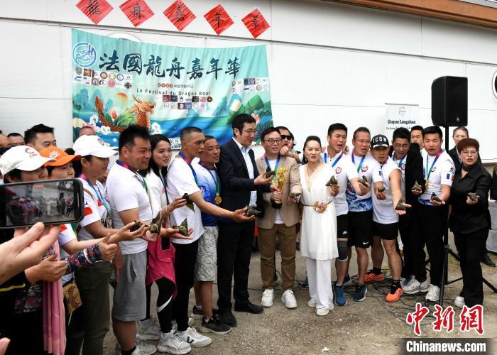 圖為中法友誼互助協(xié)會龍舟隊?wèi)c祝奪冠?!±钛?攝