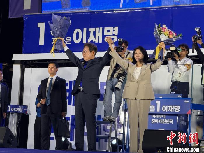 當(dāng)?shù)貢r(shí)間6月4日凌晨,韓國(guó)中央選舉管理委員會(huì)發(fā)布的計(jì)票數(shù)據(jù)顯示,共同民主黨候選人李在明確定當(dāng)選第21屆韓國(guó)總統(tǒng)。圖為當(dāng)天凌晨,李在明攜夫人金惠景在汝矣島國(guó)會(huì)附近向國(guó)民致謝。中新社記者劉旭攝