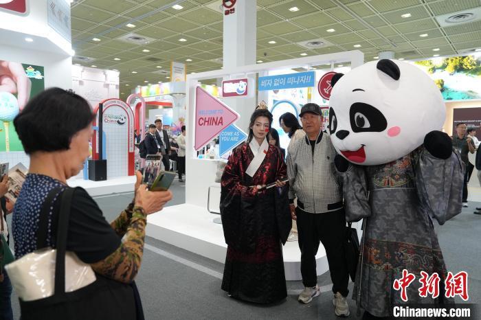 當(dāng)?shù)貢r間6月5日,觀眾在首爾國際旅游展中國主題展區(qū)與“熊貓人”合影。中新網(wǎng)記者 劉旭 攝