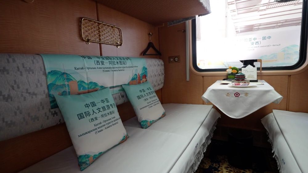 專列車身采用“絲路金橋”主題涂裝,車內(nèi)裝飾融入大雁塔、古城墻、鐘樓等西安地標(biāo)以及哈薩克斯坦地標(biāo)性建筑等元素。此外,專列上的文化活動(dòng)也格外豐富。車廂內(nèi)每日安排中醫(yī)養(yǎng)生、手工制作、書(shū)畫創(chuàng)作等文化交流活動(dòng),沿途還開(kāi)展了合唱、民樂(lè)演奏等文化展演,讓列車成為“流動(dòng)的文化交流長(zhǎng)廊”。