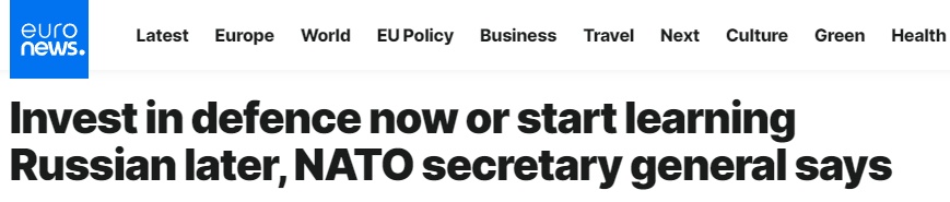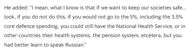 呂特說(shuō):“如果你們不(把軍事化支出)提高到5%,包括3.5%的核心國(guó)防開(kāi)支,你們?nèi)匀豢梢员A翎t(yī)療系統(tǒng)、養(yǎng)老金系統(tǒng)等等,但你們最好學(xué)會(huì)說(shuō)俄語(yǔ)。”