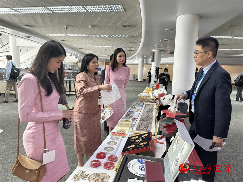 與會代表在中國展臺前欣賞傳統(tǒng)手工藝品感受中華文化。人民網記者 孫廣勇攝