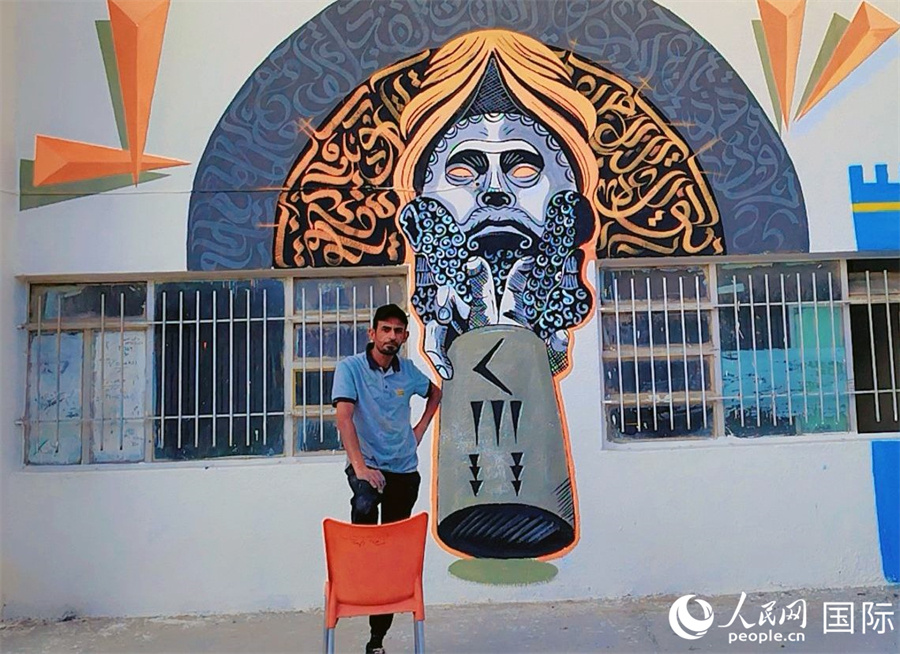 阿里·哈利法和他的壁畫。人民網(wǎng) 伊納斯·易卜拉欣攝